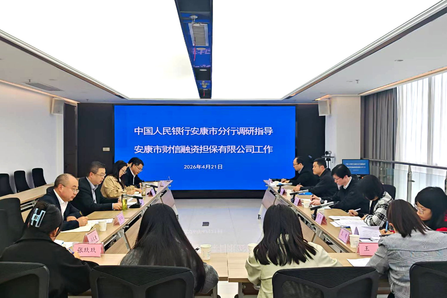 4月21日,中國人民銀行安康市分行黨委委員、副行長王玉晨帶領(lǐng)分行貨幣信貸政策管理科、金融穩(wěn)定科、征信管理科、統(tǒng)計研究科負責人一行,調(diào)研指導安康市財信融資擔保有限公司工作。公司董事長滕海濤、總經(jīng)理陳步華參加調(diào)研。